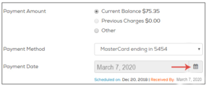 - Click the calendar icon to the right of Payment Date and click the date you’d like to make your payment. Make sure you schedule your payment on or before the due date to avoid possible late fees.